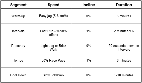 Here are two examples of structured treadmill workouts based on race distances. Note that these are guidelines and should be modified based on your current fitness and rehab needs.