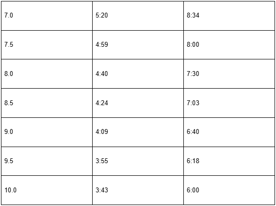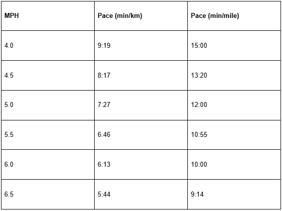 Many treadmills show speed in miles per hour (MPH), but most running plans use minutes per kilometre. Use this chart to quickly convert: